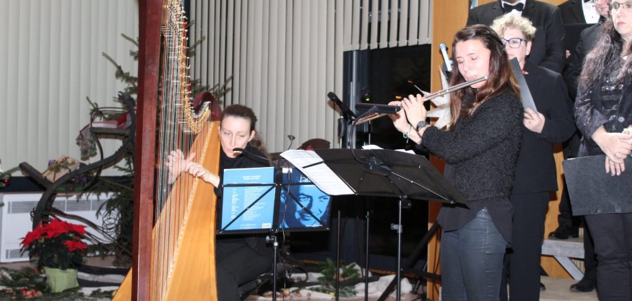„Lassen Sie sich während eines harmonischen Abends verzaubern“, begrüßten die Vorsitzende Yvonne Wolf vom Frauenchor „Cantabile“ und der Vorsitzende Daniel Fritsch vom MGV Nassovia-Frohsinn ihr Publikum. Abwechselnd und gemeinsam zelebrierten die beiden Chöre ihre Melodien. Als Solistinnen brillierten Julia Pritz mit ihrem Harfenspiel und Polina Blüthgen mit ihrer Querflöte. Neben vielfältigen Instrumental-Vorträgen untermalten sie auch etliche Lieder des Frauenchores mit ihren Instrumenten. Als Klavier-Solist mit leisem Vorspiel und engagierter Klavier-Begleitung begeisterte auch der musikalische Leiter des Adventskonzerts, Simon Fell.