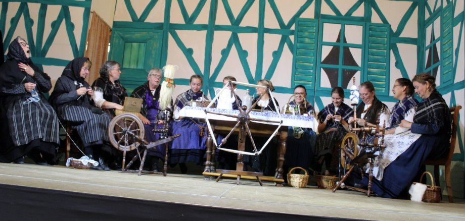 Aus dem Vollen schöpften die „Haaheapper“ mit ihren 30 Akteuren bereits zum Auftakt ihres Streifzuges durch das Dorfgeschehen. In großer Runde hockten die Mädchen und Frauen in ihren unterschiedlichen Trachten in der Spinnstube, hechelten neben ihrem eifrigen Handwerkern die neusten Gerüchte durch, lästerten über die Mannsbilder, deren Kommen sie dennoch herbei sehnten.