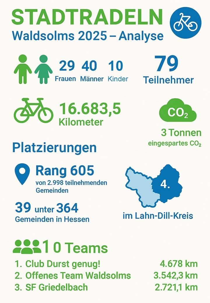 Wir verzeichneten einen Teilnehmerrekord mit 10 Kindern, 29 Frauen und 40 Männern, die zusammen in 945 Fahrten insgesamt 16.683,5 Kilometer erradelten. Dadurch konnten wir 3 Tonnen CO2 einsparen.