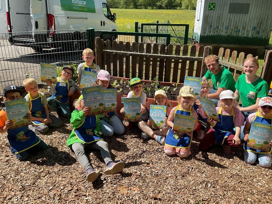 Mit einem geschulten Team der EDEKA Stiftung bereiteten die 12 Schulanfänger der Kita Abenteuerland gemeinsam das Hochbeet vor, indem frische Erde aufgefüllt und Naturdünger eingearbeitet wurde.