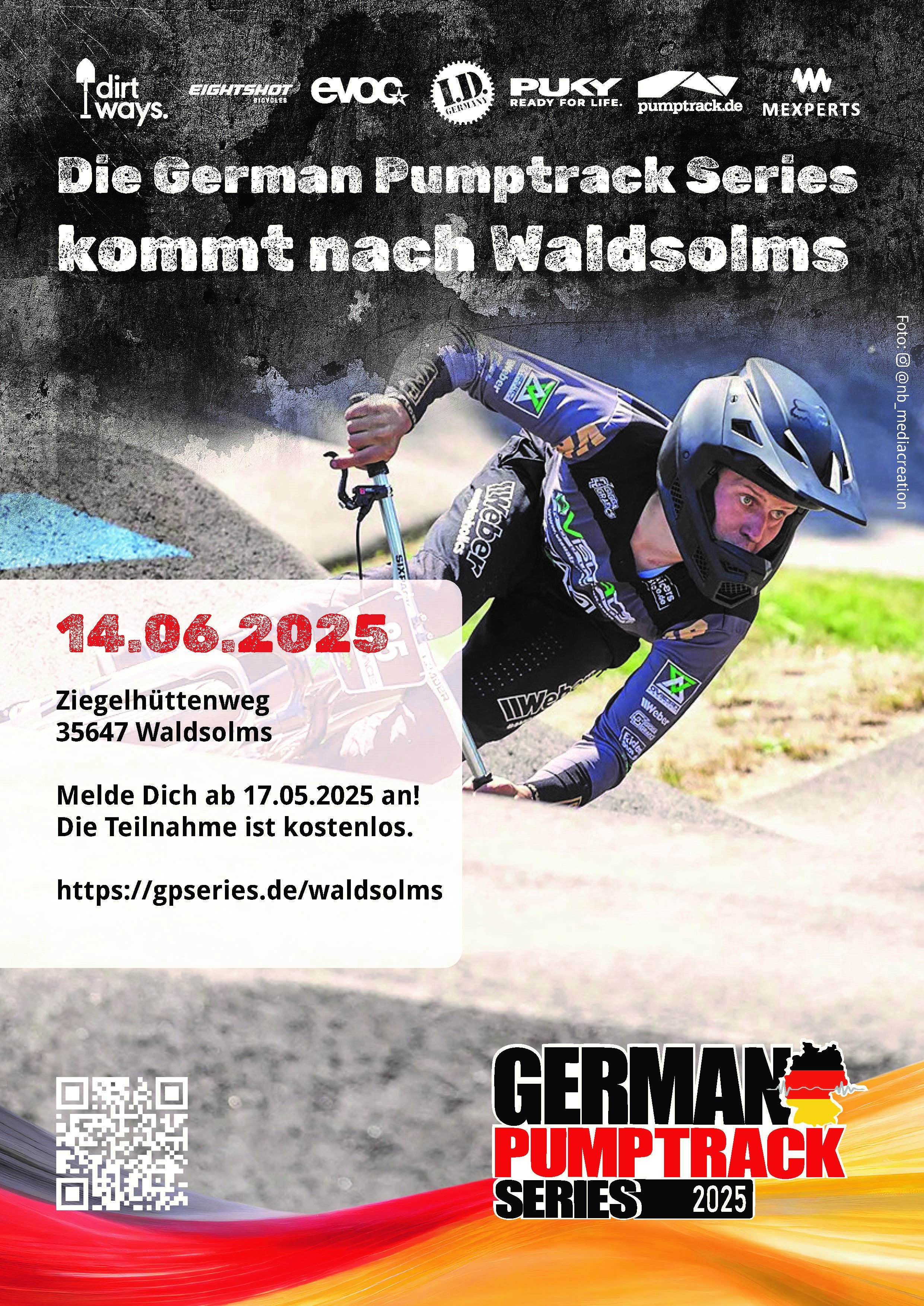 Waldsolms, 20. Mai 2025 – Am 14.06.2025 macht die German Pumptrack Series 2025 (GPS) Halt in Waldsolms. Auf dem Asphalt Pumptrack in Waldsolms erwartet Besucher*innen ein actionreicher Renntag mit BMX-, Dirt- und Mountainbikes, spannenden Zeitläufen und Wettkampfspaß im lockeren Umfeld. Auch für Zuschauer*innen lohnt sich der Besuch: Die spannenden Rennen bieten beste Unterhaltung. Veranstaltet wird das Rennen vom StreetGrown e.V., dem Initiator der ersten German Pumptrack Series.